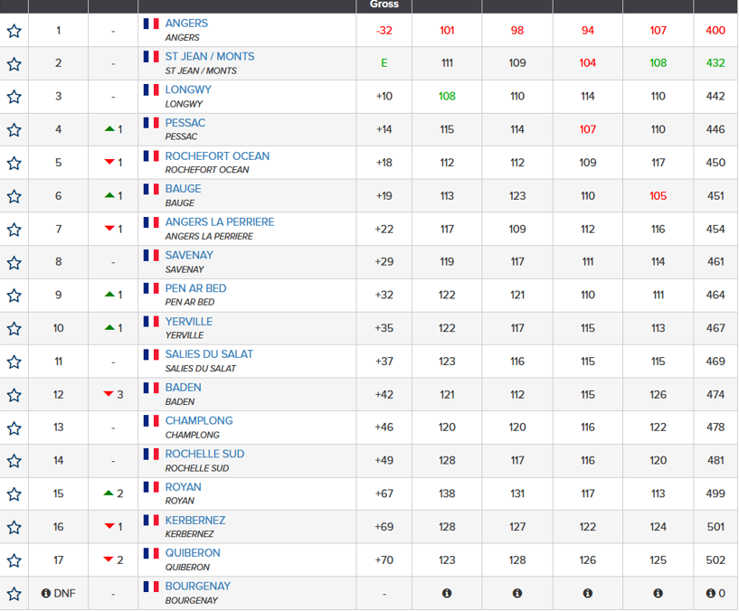 Angers domine sans partage : Au terme des quatre tours de compétition, l’équipe d’Angers s’est imposée avec brio, totalisant -32, grâce à la régularité de Elliott Lerays, Fabien Ferrand, Louis Malouin et Enaël Aguile. Les tenants du titre de Saint-Jean-de-Monts terminent deuxièmes dans le par, suivis de Longwy (+10).