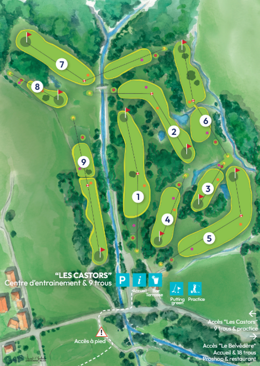 Le golf des Alpes possède une parcours d’entrainement 9 trous accessible en part 3 des départs orange.